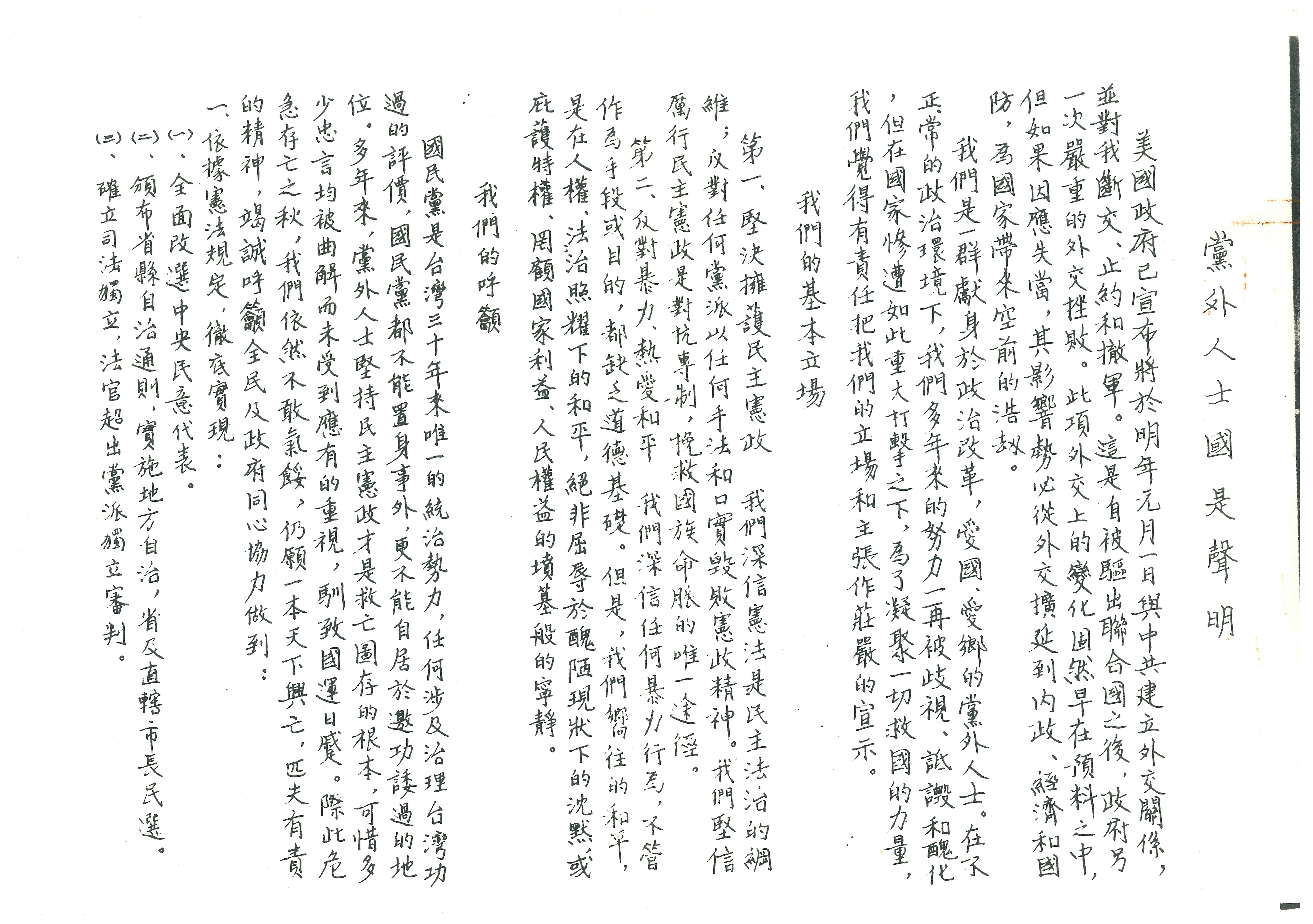 (二)、應使國民黨了解,繼續推展民主憲政,不僅符合台灣人民的利益也符合國民黨的利益。任何軍事統治的傾向,不僅無益於台灣人民,也不利於國民黨。我們沒有消滅國民黨的企圖,我們只盼望在合法、和平的狀況下促進人權與民主。