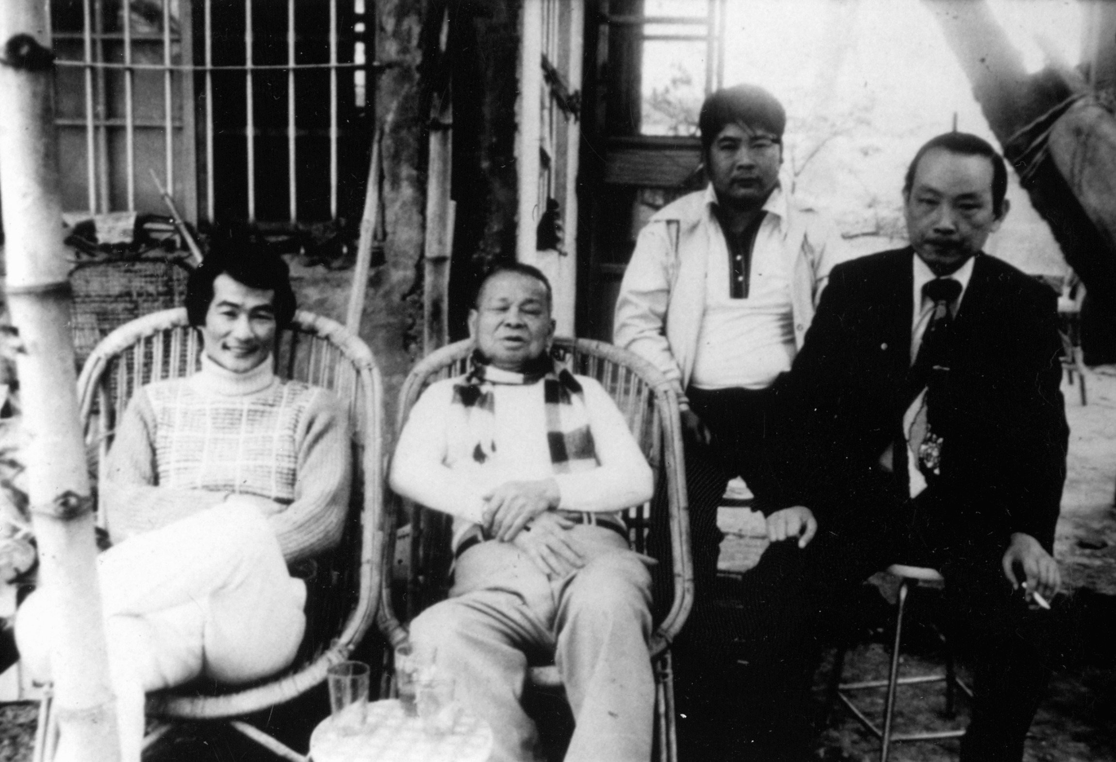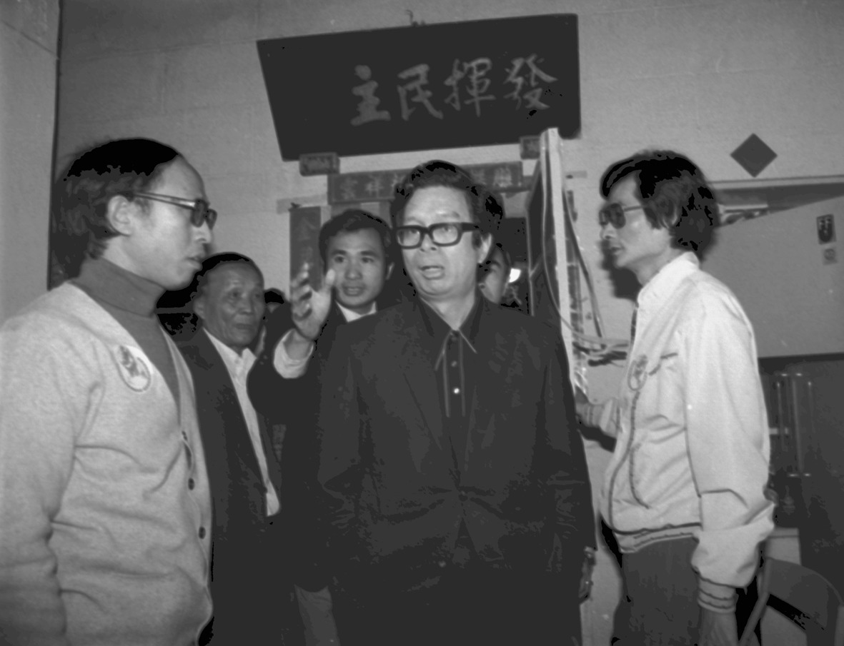 黨外總部總幹事施明德,至八卦寮拜訪前高雄縣長余登發,報告黨外狀況,以及在高苑高工舉行首次黨外新年團拜活動事宜。施明德、余登發、辜水龍、張武彥。(左至右)