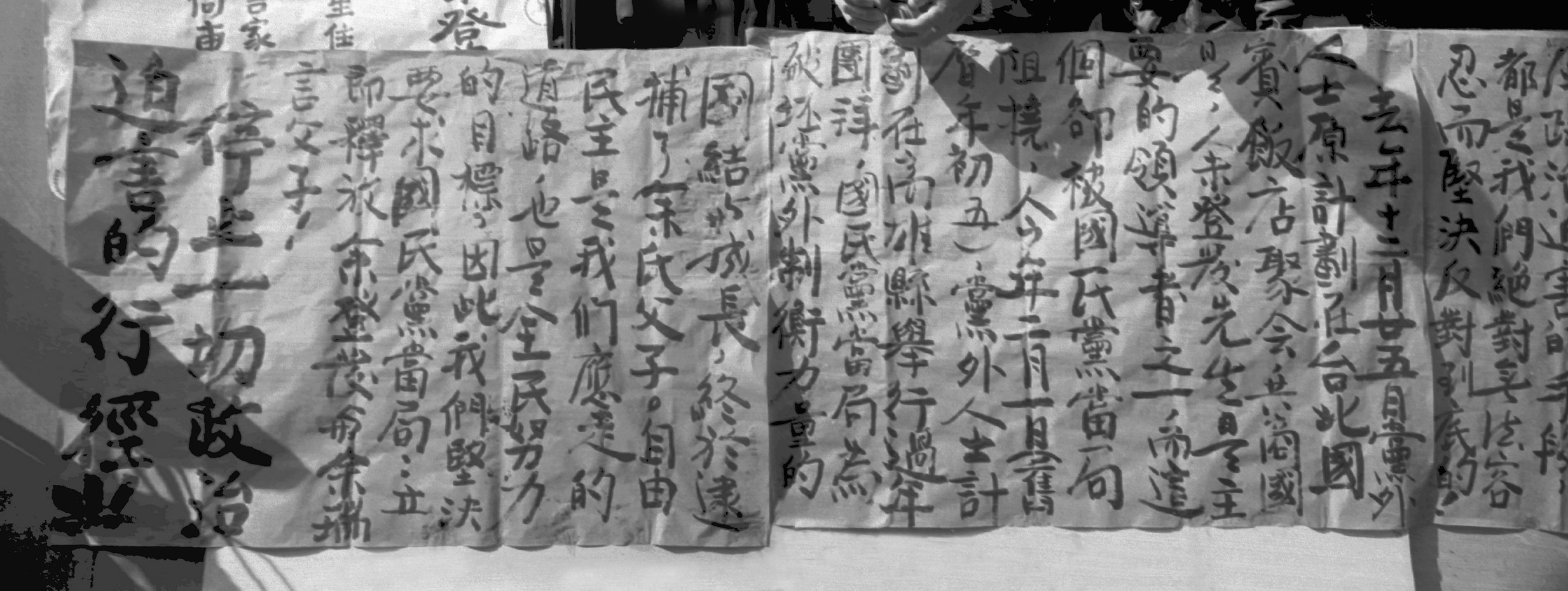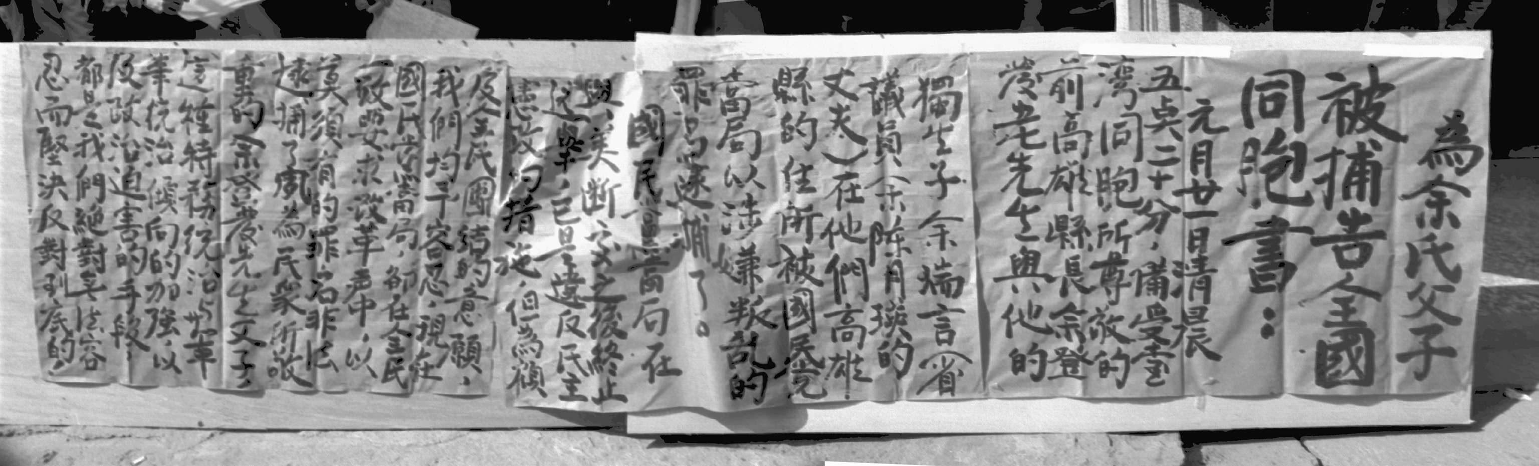 法律保障佈告欄可以張貼文字!撕毀佈告欄文字的是不法之徒!」蕭裕珍和曾心儀則在人群中振臂高呼:「誰無父母子女?我們抗議國民黨逮捕余氏父子!」