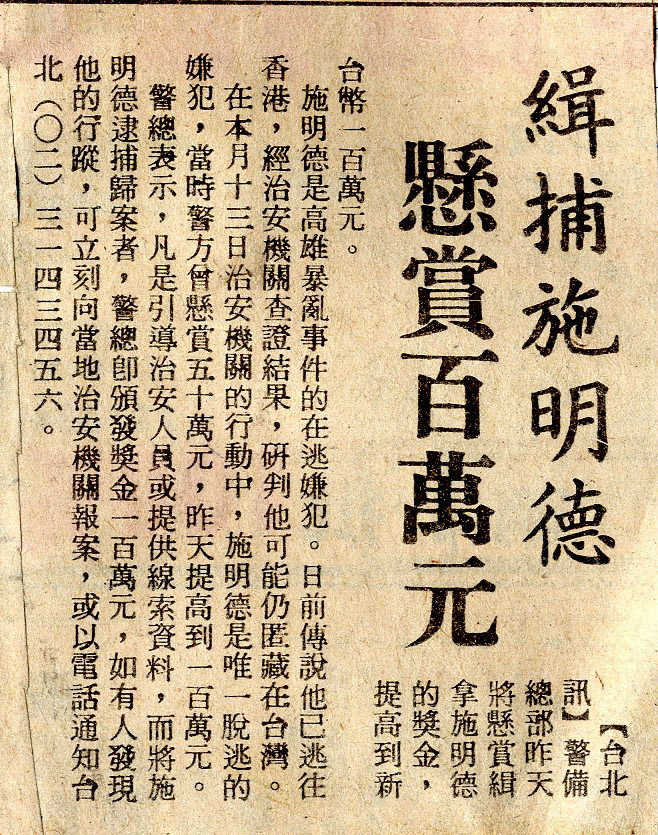 第二天,趙振貳去找高牧師,我抱著一絲期待在等消息,一直沒有回音。這期間我的照片已出現在報紙上,獎金提高到一百萬。電視新聞風聲鶴唳、義憤填膺,沒幾分鐘就通緝一次,人人皆曰可殺的聲音充斥整個新聞,我看了心裡實在不舒服。終於,趙回來說高牧師找到人要載我去宜蘭,但我認為不妥。後來安排我到林文珍長老家。