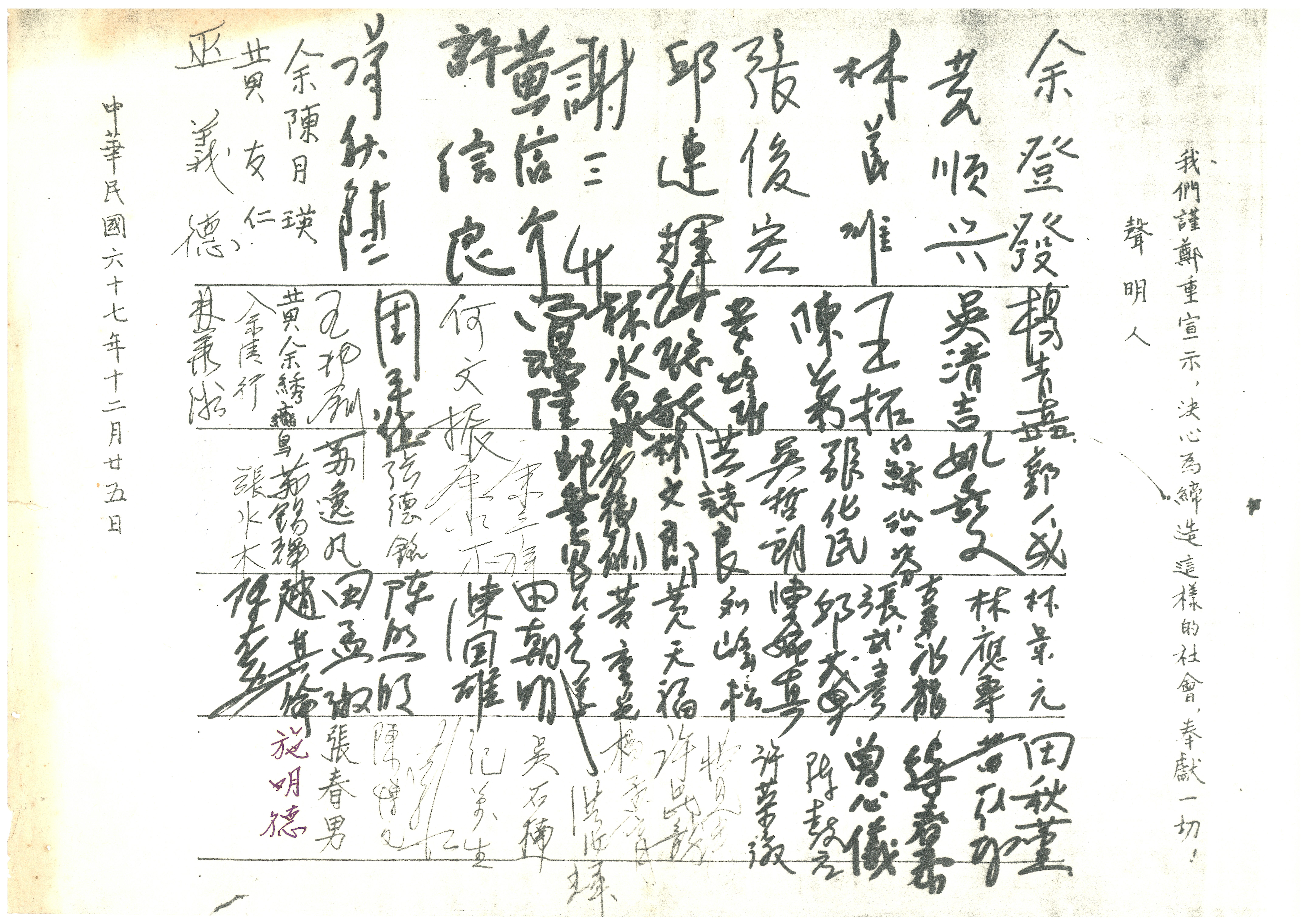 我們是一群獻身於政治改革、愛國、愛鄉的黨外人士。在不正常的政治環境下,我們多年來的努力一再被歧視、詆毀和醜化,但在國家慘遭如此重大打擊之下,為了凝聚一切救國的力量,我們覺得有責任把我們的立場和主張作莊嚴的宣示。