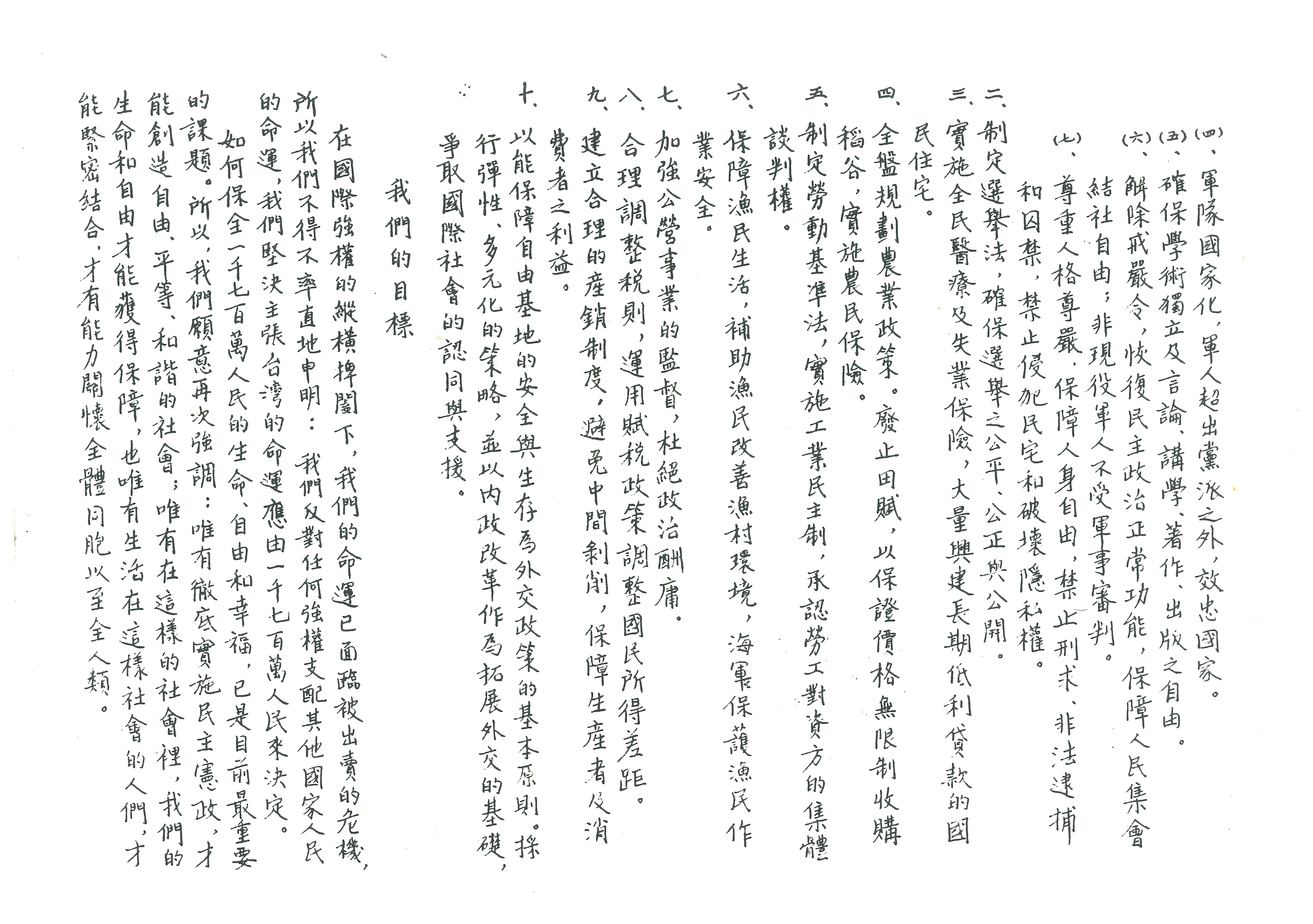 如何保全一千七百萬人民的生命、自由和幸福,已是目前最重要的課題。所以,我們願意再次強調:唯有徹底實施民主憲政,才能創造自由、平等、和諧的社會,唯有在這樣的社會裡,我們的生命和自由才能獲得保障,也唯有生活在這樣社會的人們,才能緊密結合,才有能力關懷全體同胞以至全人類。